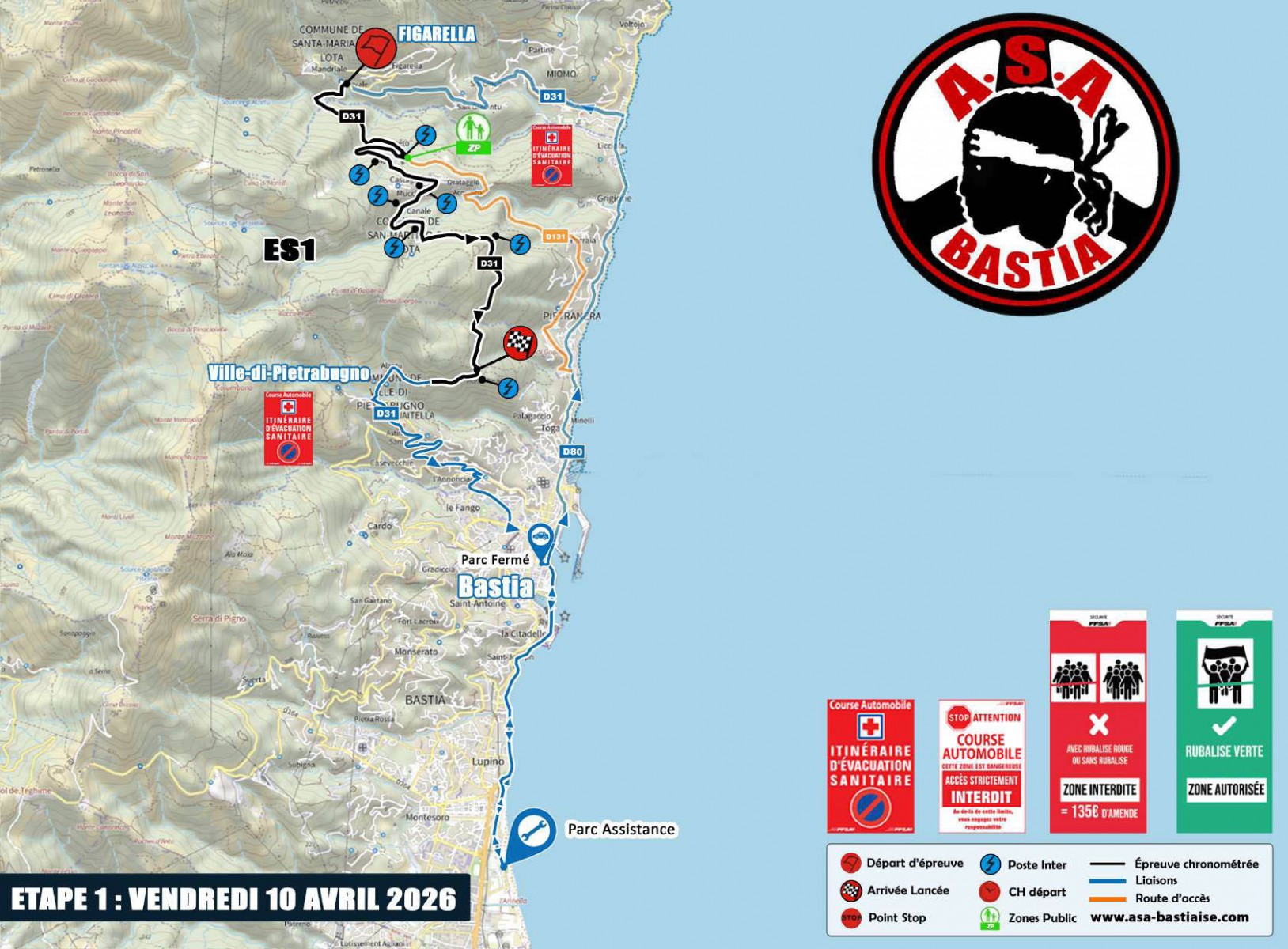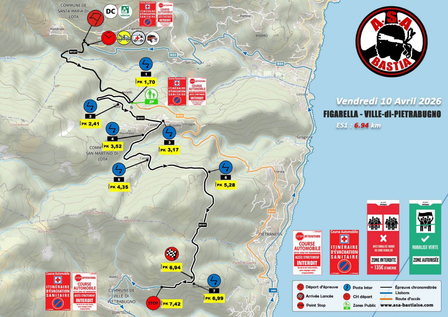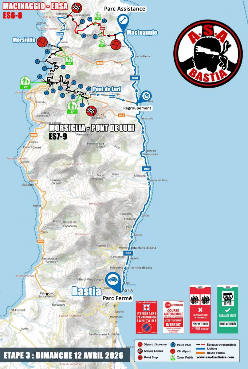 Pour les spectateurs, information importante communiquée par les organisateurs : « Afin d’assurer l’entière sécurité sur cette « ES » (épreuve spéciale) ayant eu succès avec la présence de nombreux spectateurs l’an passé, nous vous informons que dès lors que la dernière voiture ouvreuse (0) prendra le départ, il ne sera plus possible de circuler à pieds entre l’arrivée lancée « Belvédère/Croix de Ville di Pietrabugno » au PK : 6,94 et le point STOP « Entrée Alzeto » au PK : 7,42 jusqu’à la fin de l’épreuve spéciale, au passage de la voiture DAMIER.«