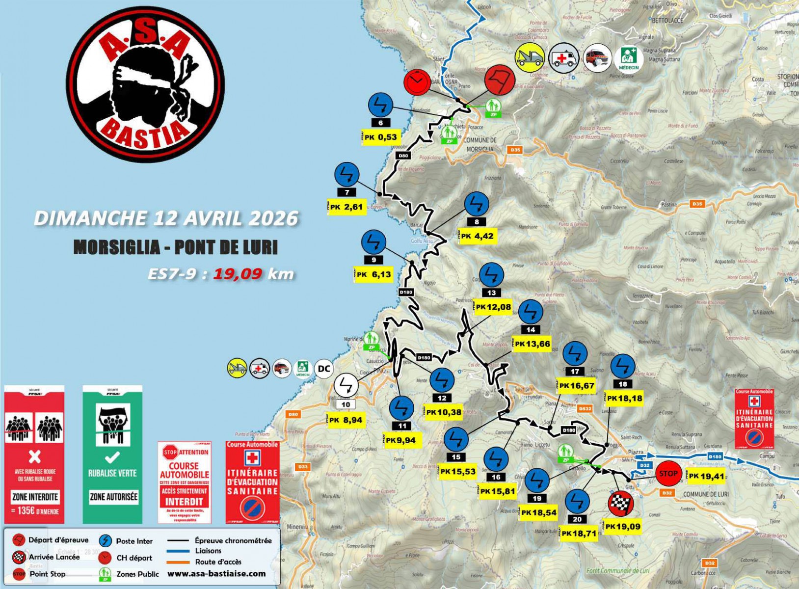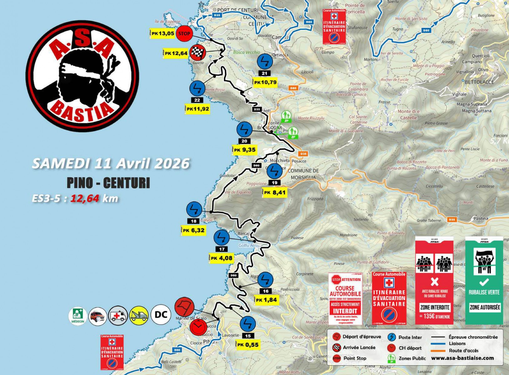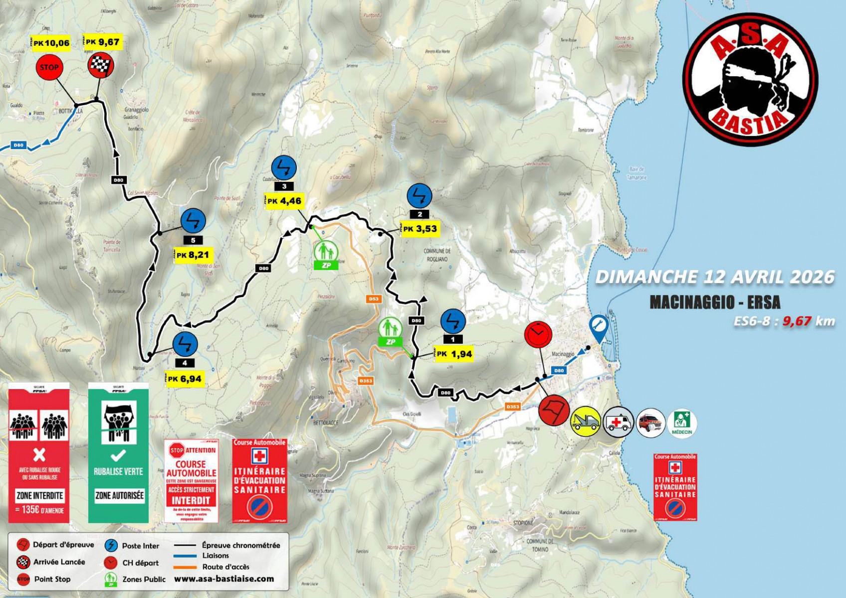Pour les spectateurs, information importante communiquée par les organisateurs : « Afin d’assurer l’entière sécurité sur cette « ES » (épreuve spéciale) ayant eu succès avec la présence de nombreux spectateurs l’an passé, nous vous informons que dès lors que la dernière voiture ouvreuse (0) prendra le départ, il ne sera plus possible de circuler à pieds entre l’arrivée lancée « Belvédère/Croix de Ville di Pietrabugno » au PK : 6,94 et le point STOP « Entrée Alzeto » au PK : 7,42 jusqu’à la fin de l’épreuve spéciale, au passage de la voiture DAMIER.«