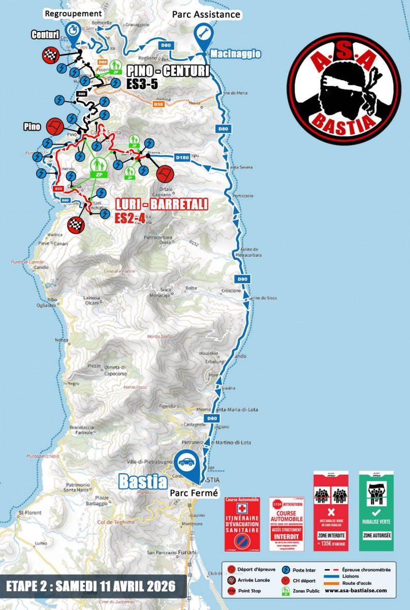 L’étape du Samedi est composée de deux spéciales qui seront à parcourir à deux reprises. Les équipages commenceront par la longue spéciale entre Luri et Barrettali, puis enchaineront avec la spéciale entre Pino et Centuri. L’itinéraire évolue donc sur le premier chrono du jour, avec non plus un départ du Col St Lucie, mais 5 km plus bas, au village de Luri, haut lieu de la Ronde. De la même manière, l’arrivée ne se fera plus à Canari, mais 5 km en amont ,juste après Barrettali, sous le croisement de Conchigliu. La longueur de cette spéciale est raccourcie, passant de 20,73 km en 2025, contre 19,37 km cette année.