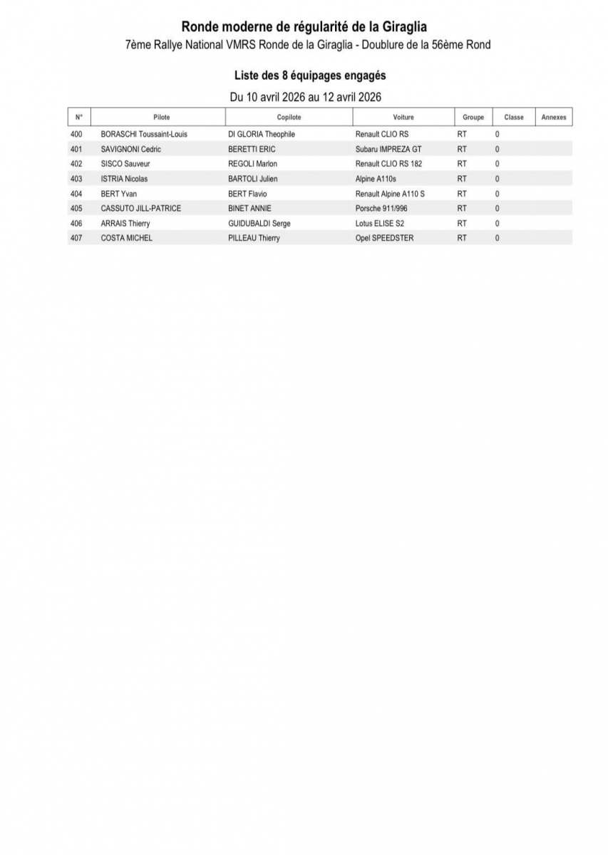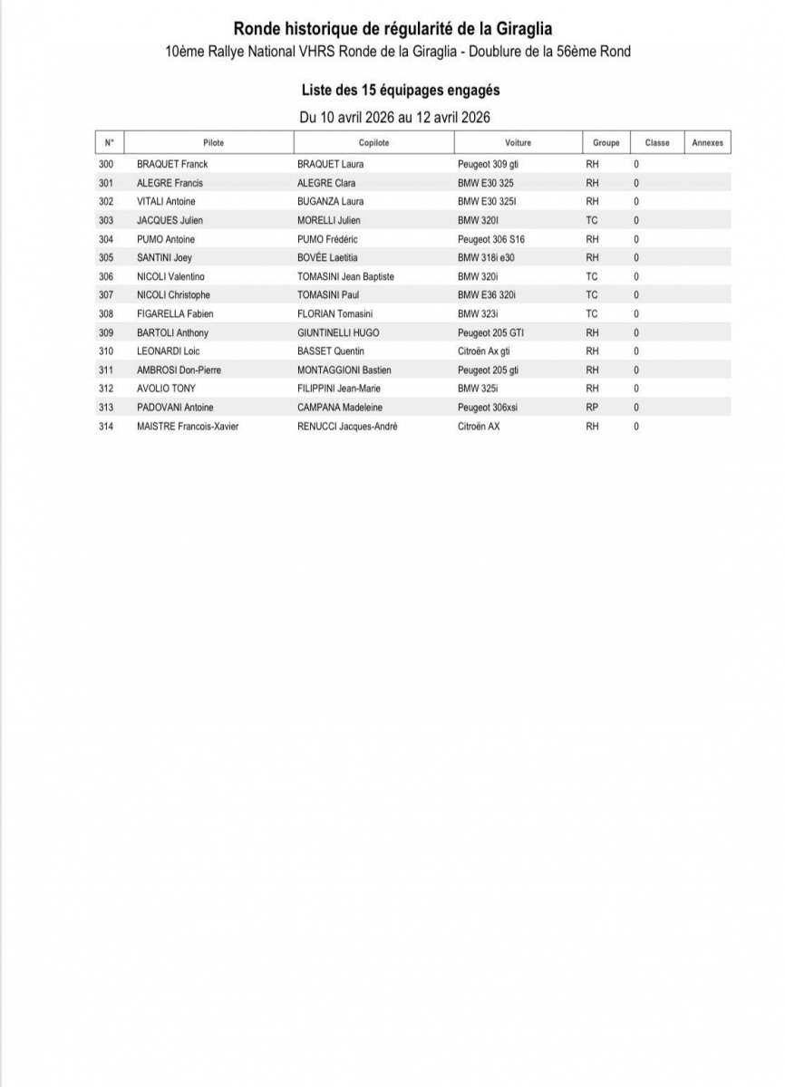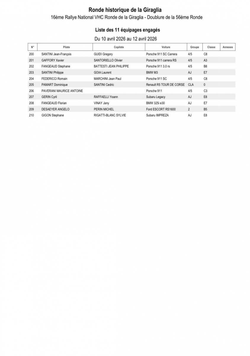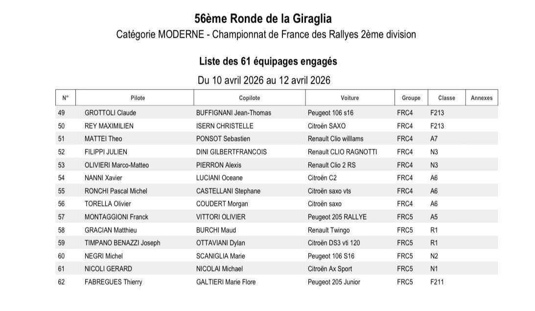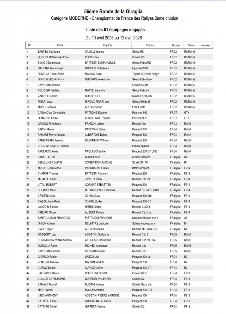 Après avoir longtemps évolué sur l’Alpine A110 GT+, Christophe Casanova se présentera cette fois-ci au volant d’une Porsche 992 GT+, avec laquelle il pourrait surprendre. Vainqueur en catégorie Rally4 l’an dernier, Anthony Gandolfi s’alignera cette année avec une Clio Rally3, et visera forcément un bon résultat. En catégorie Rally4 justement, Marco Papini sera le favori, et lui aussi peut viser haut au classement scratch. Henry Baldrichi, terreur du F2-13, cherchera lui aussi la belle performance.