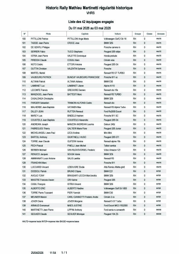 Vainqueur en titre, Dumè Marcelli sera de nouveau présent, et tentera de doubler la mise au volant de sa BMW M3. Face à lui il trouvera notamment les deux pilotes qui l’ont accompagné sur le podium l’an dernier ; Frédéric Stofati (BMW M3), et Jean-Toussaint Albertini (Ford Escort Mk2). Autres pilotes qui voudront lui contester la victoire, Jérôme Mancini (BMW M3), Paul De La Foata (BMW M3), ou encore Jean-Baptiste Botti (Porsche 911 SC). Autant dire que la bagarre fera rage pour décrocher le trophée 2026 !