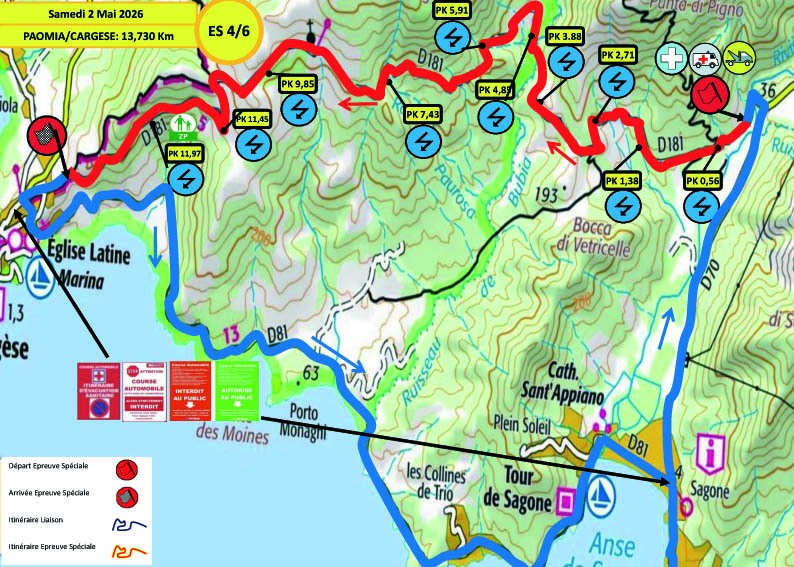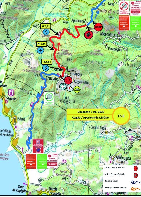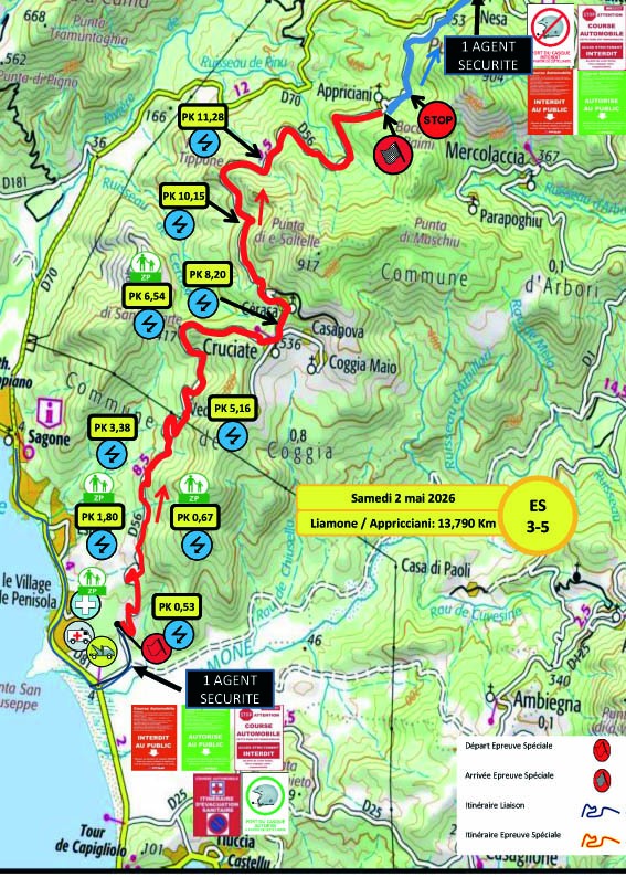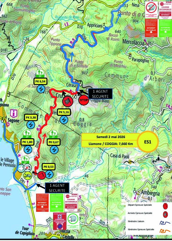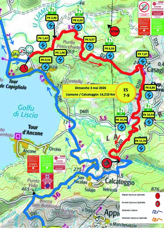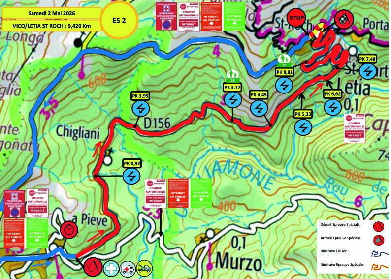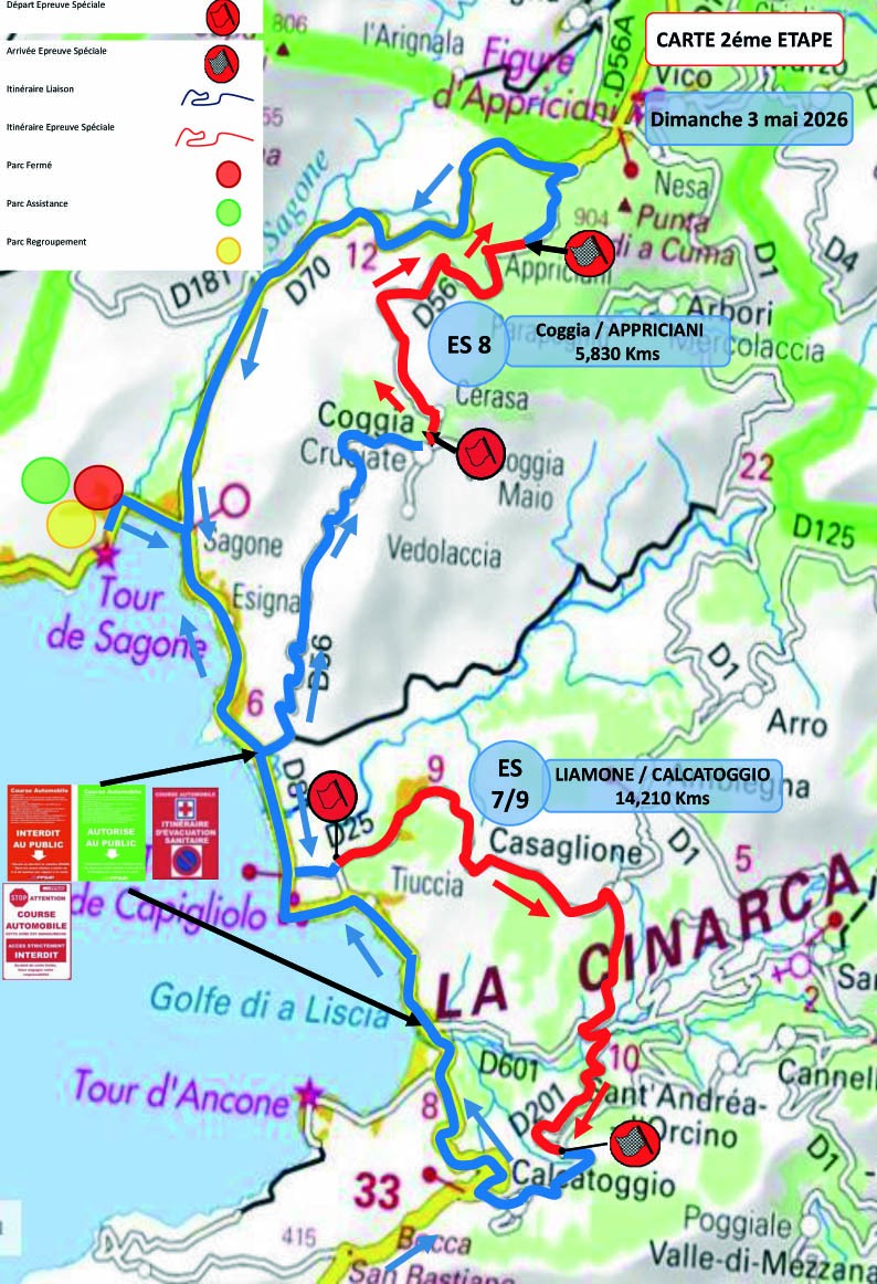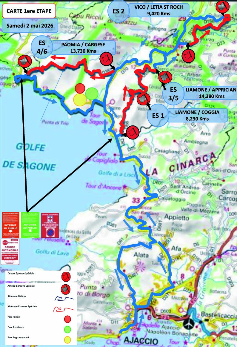 L’étape du Samedi sera tout d’abord composée de deux spéciales à parcourir une fois, avec la classique entre Liamone et Coggia, puis le chrono entre Vico et Letia Saint Roch. La différence avec l’édition précédente se situe là, puisque la spéciale de Vico était parcourue à deux reprises jusqu’à présent ; elle ne le sera qu’à une seule reprise cette année. Après cette première boucle, un reclassement sera effectué, puis nous retrouverons deux spéciales à parcourir deux fois. Tout d’abord la spéciale entre Liamone et Appriciani, qui est la même que celle du matin, mais en version plus longue, puis la spéciale entre Cargèse et Paomia qui a donc inversé son ordre dans le programme par rapport à l’édition 2025. Autre changement, pour la spéciale du Liamone, le départ se fera 580 m plus loin que les autres années, directement dans la première épingle…